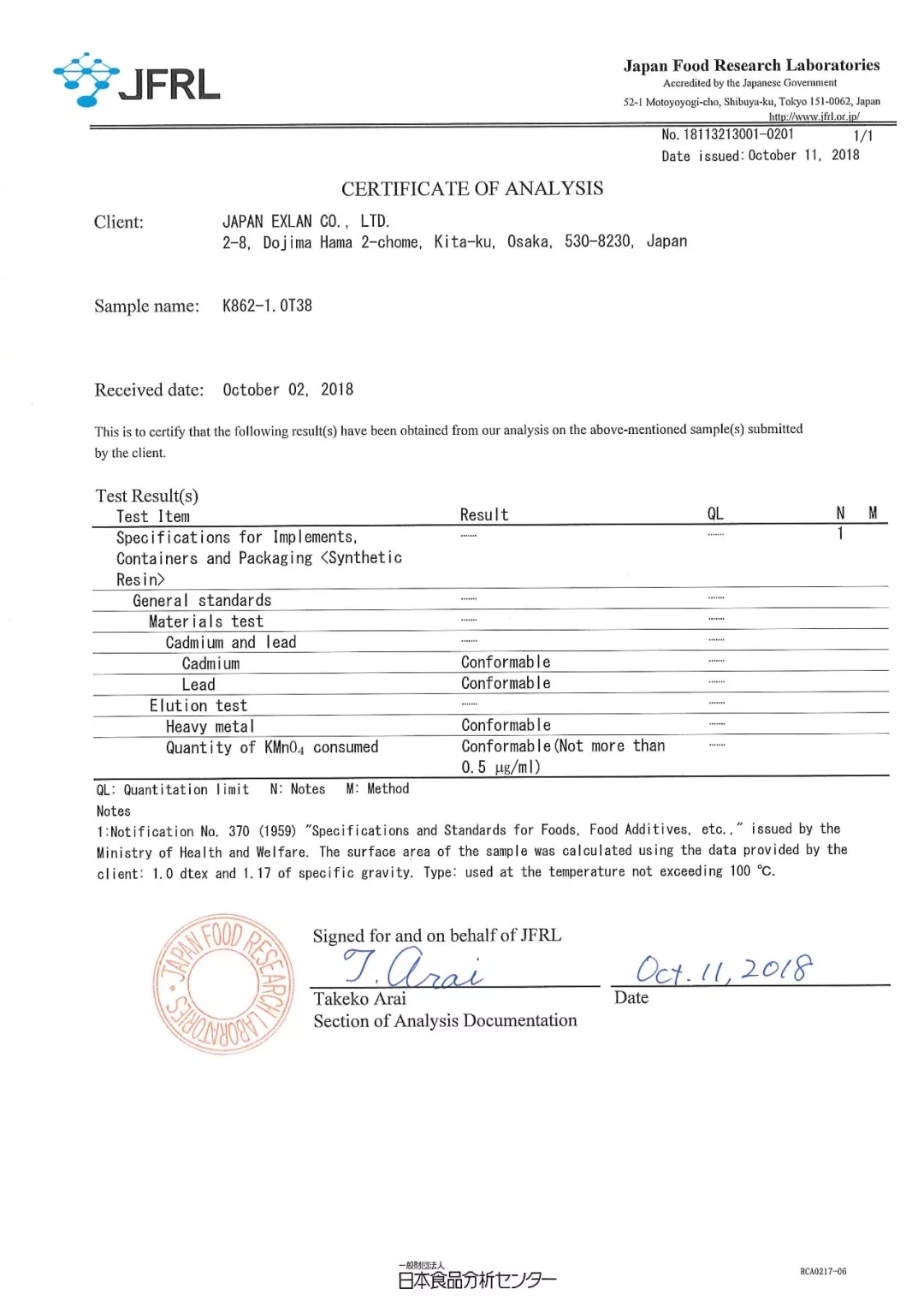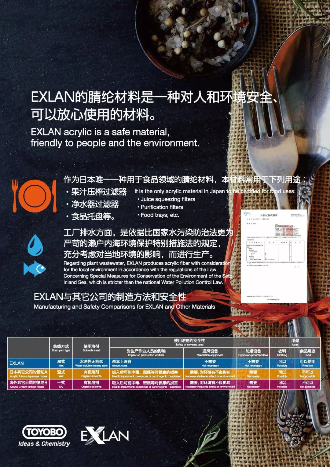 特殊的地理位置,嚴苛的標準,特殊的生產工藝造就了更安全的食品級東洋紡腈綸。公司腈綸產品通過日本食品研究實驗室JFRL的檢驗。