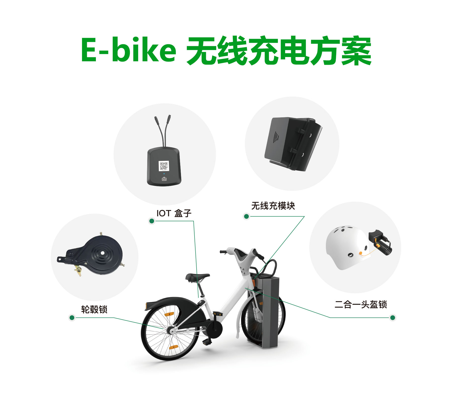 E-bike無線充電樁解決方案,多種定點停車方案,高功率充電效率,停車即刻充電,停車樁可適配品牌風(fēng)格,提高品牌效益,通過軟硬件結(jié)合,實現(xiàn)掃碼開鎖使用,關(guān)鎖自動結(jié)費,應(yīng)用GPS定位和遠(yuǎn)程控制車輛速度,IOT內(nèi)置傳感檢測報警,后臺實時監(jiān)控車輛狀態(tài),電量等信息。
