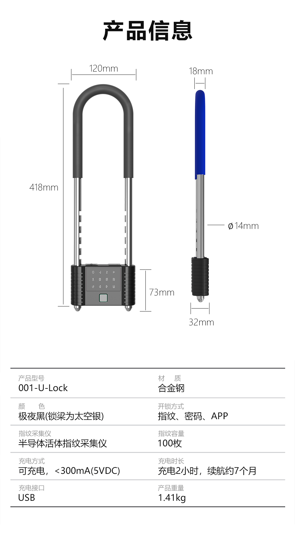 歐米智能U型鎖防盜液壓抗剪,無需鑰匙開鎖,手機APP,密碼指紋輕松解鎖,設備可共享給身邊的親朋好友,并且權限可以隨時收回,一把鎖可供好幾人一起使用,手機APP上會有U型鎖電量顯示,電量不足時會發出提示,產品在開鎖時會生產開鎖記錄,隨時隨地了解鎖在什么時間打開,產品具有IP66的防護等級,即使是在下雨天氣也能使用,智能U型鎖采用USB接口充電,充一次電可使用180天(按照一天開鎖一次來算)。